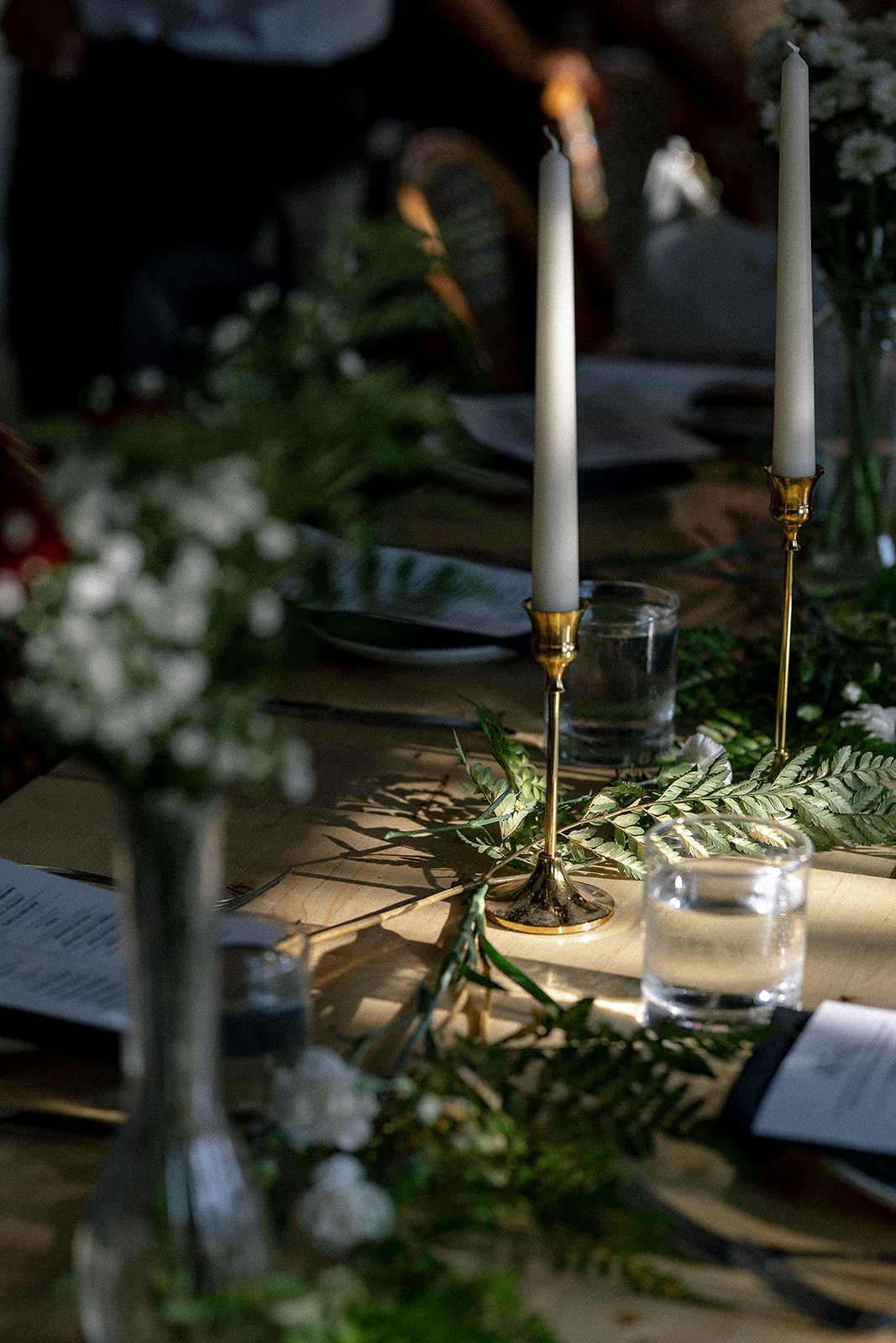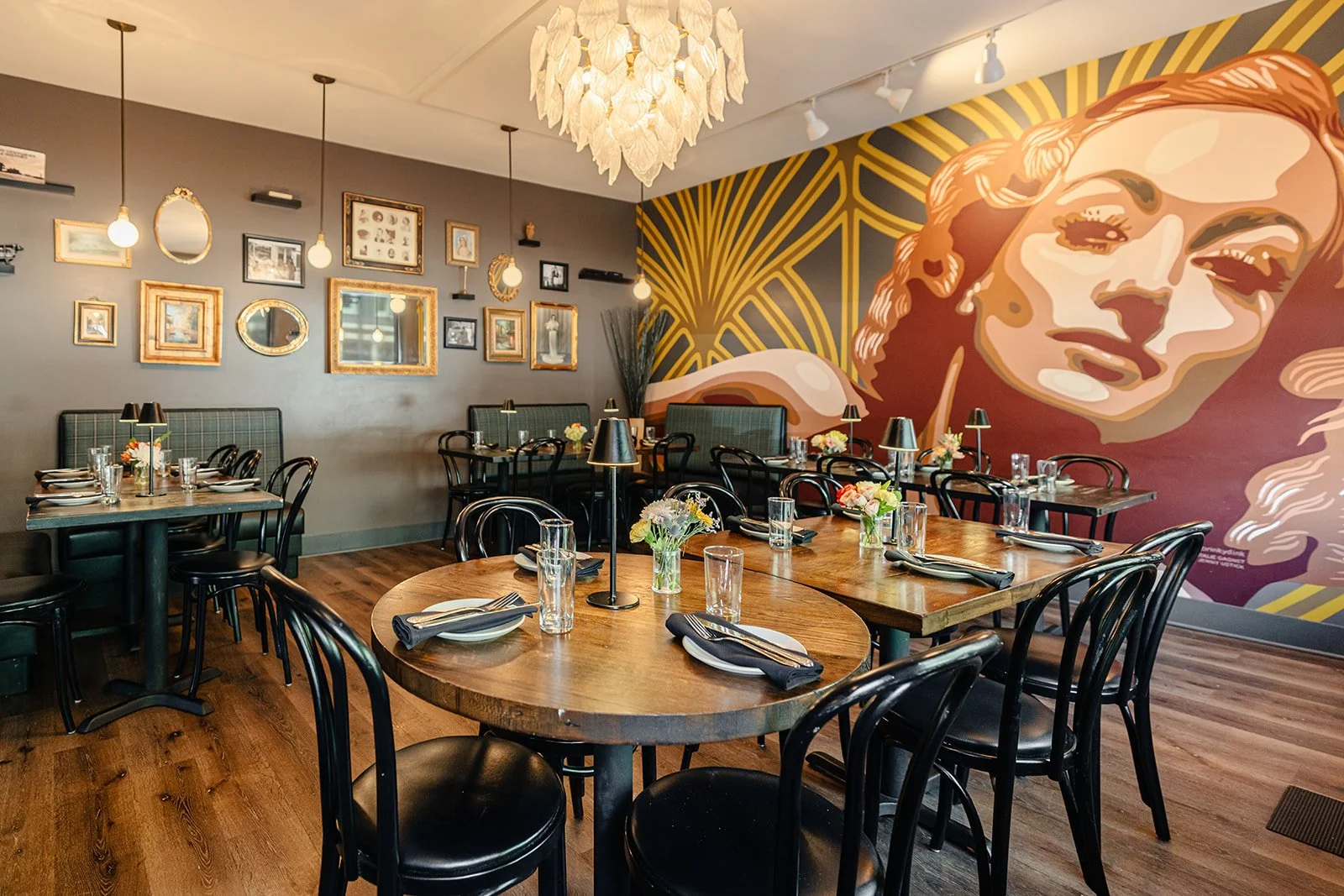 A long dining table set for a celebration with floral centerpieces, plates, glasses, and cutlery in a restaurant or event space. There are people standing and walking around, and the room features colorful wall art and a bar area.