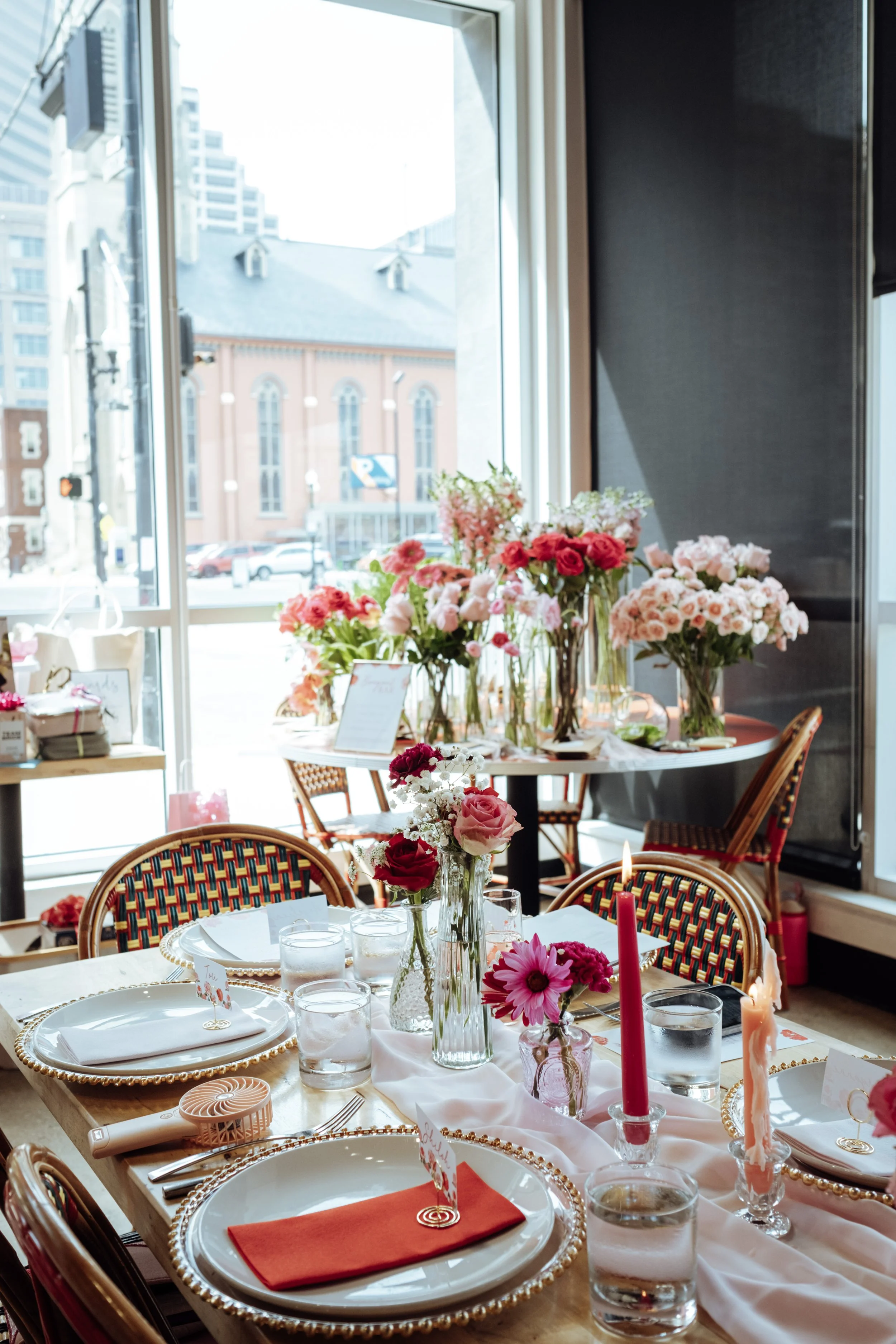 A long dining table decorated with pink and white flowers, candles, and place settings in a brightly lit restaurant or event space, with people standing and chatting near the far end.