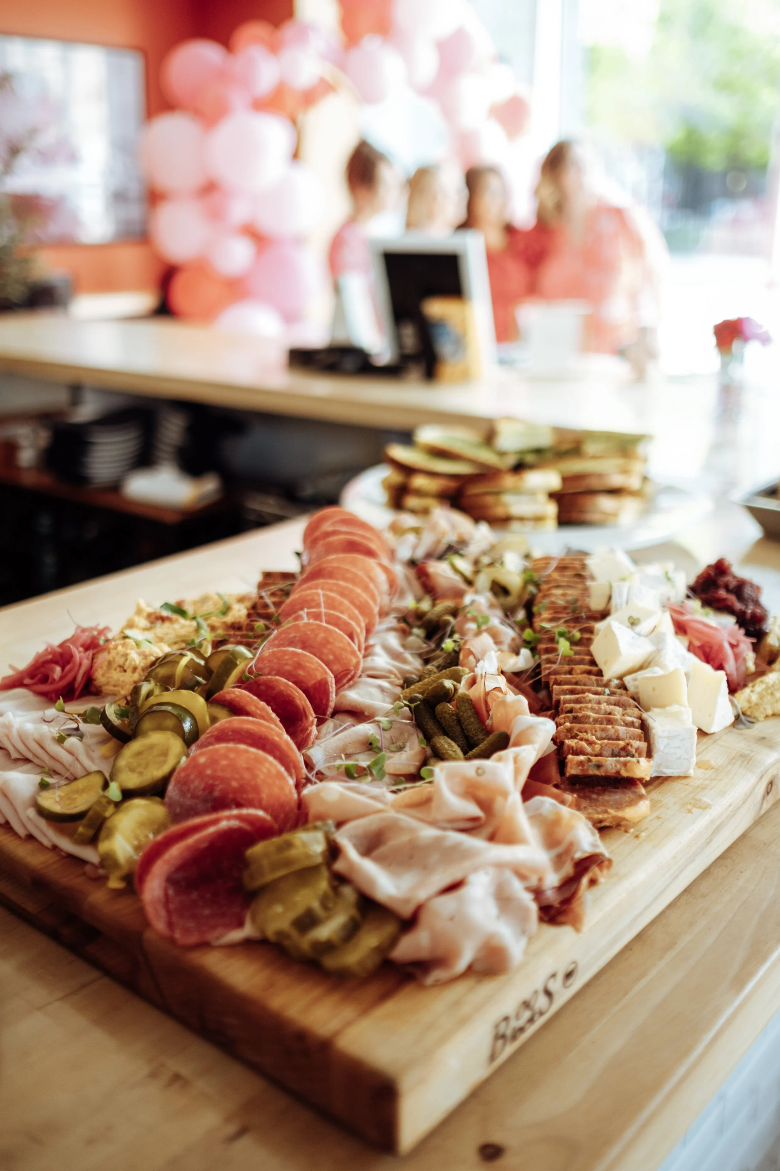 A wooden platter of assorted meats, cheeses, pickles and cured meats at a party, with stacked bread slices in the background and pink balloons and people in the blurred background.